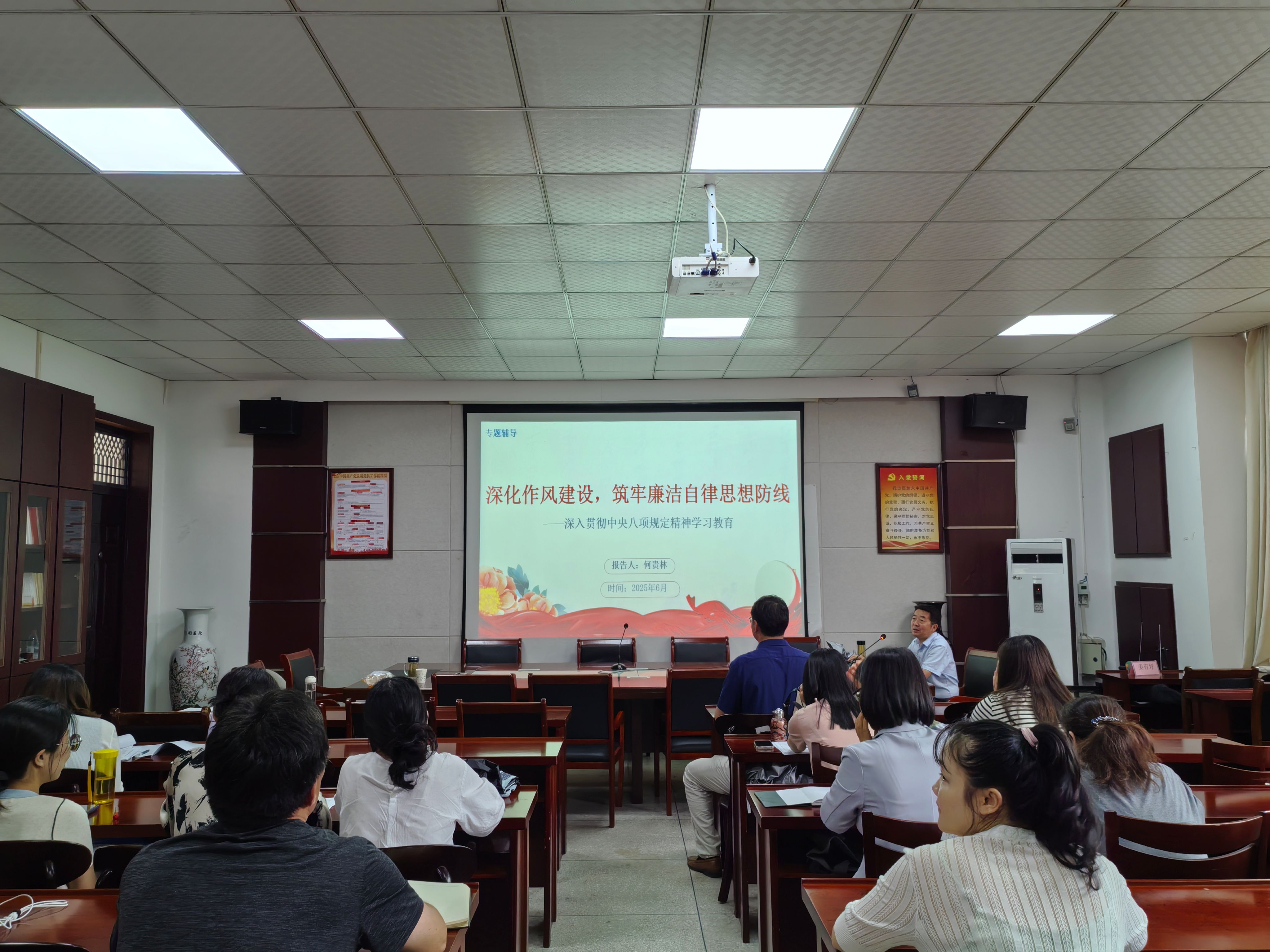 2025年6月11日下午,公司举办深入贯彻中央八项规定精神学习教育专题辅导会,邀请校纪委副书记、纪委办公室主任何贵林同志作专题辅导报告。公司全体教师党员参加,会议由公司党委书记张乐民主持。