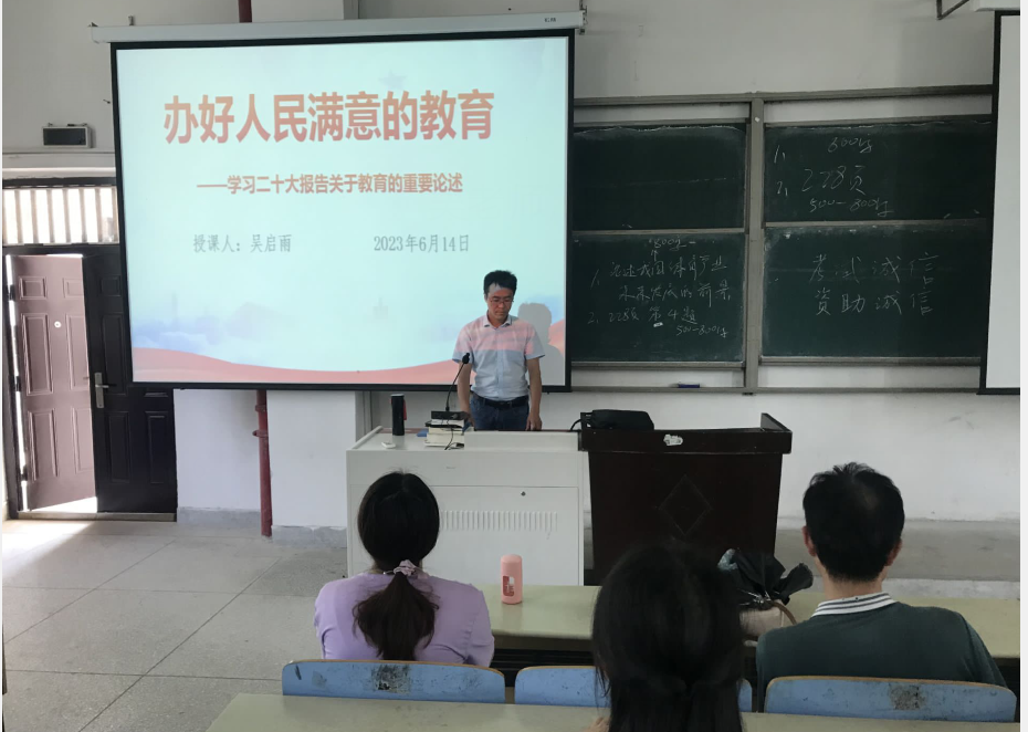 6月14日下午,太阳成集团122ccvip教工一支部于博学阶101教室开展“办好人民满意的教育——学习二十大报告关于教育的重要论述”党课活动,活动由支部书记鲁萍主持,支部组织委员吴启雨老师进行授课。支部全体党员参加了此次活动。