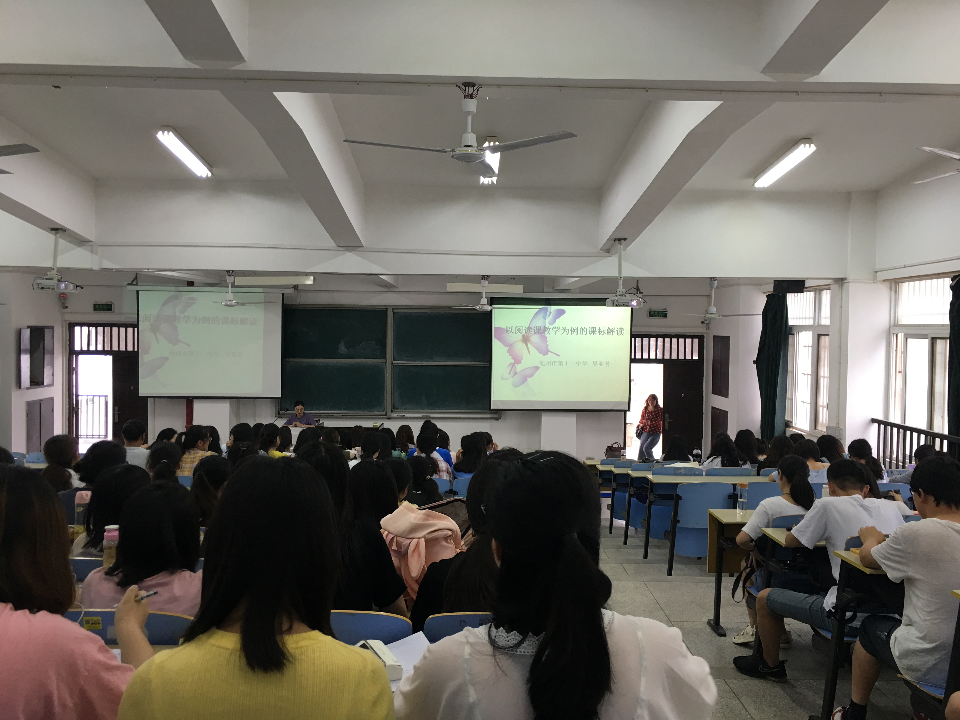 吴亚芳和杨晖老师都是池州市优秀教师、池州市十一中英语骨干教师,有着丰富的教学经验。两位老师分别从阅读和备课两个角度,对中学英语教材和课标进行了解读和分析。两位教师理论深厚、实践丰富,上课幽默风趣,受到同学们的热烈欢迎。