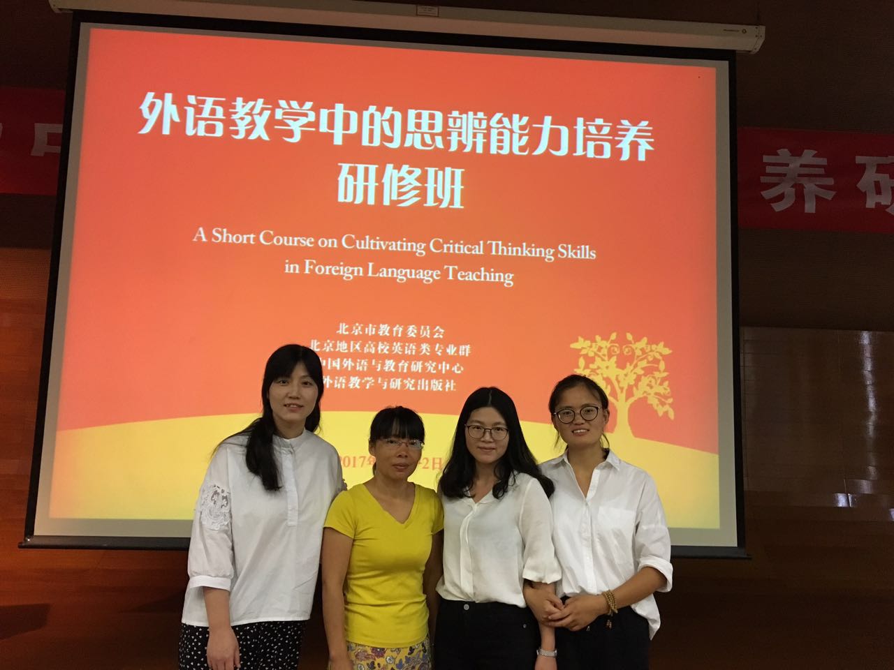 语言是思维的展现,思维的训练与提升和语言学习密不可分。为帮助外语教师进一步了解思辨的内涵及外延,推动高校外语教学中的思辨能力培养,优化教学实践,促进教学研究,2017年8月1至2日,由北京市教育委员会、北京地区高校英语类专业群、中国外语与教育研究中心、外研社共同主办的“外语教学中的思辨能力培养”研修班在外研社国际会议中心成功举行。公司太阳成集团122ccvip汪媛、刘翠萍、程秀苹、汤丹等4名教师参加了本次研修班。