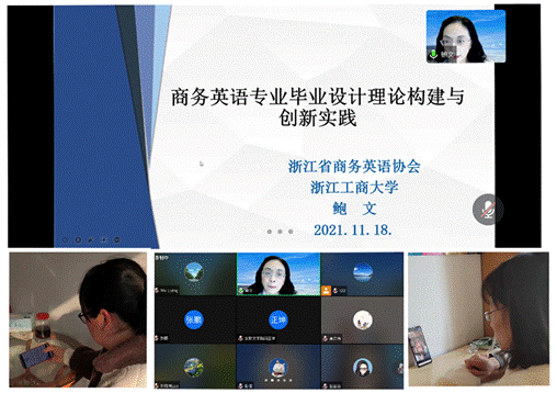 研讨会邀请浙江工商大学鲍文教授作“商务英语专业毕业设计理论构建与创新实践”主旨报告。鲍文教授介绍了商务英语毕业设计的理论基础及设计概论,分享了浙江工商大学商务英语专业毕业设计的具体实施方案、流程及部分选题实例。在鲍文教授的主题演讲结束后,两校老师围绕商务英语教学工作、信息化教学建设开展交流,就本校开展商务英语毕业设计改革试点过程中发现的问题进行“云”讨论。