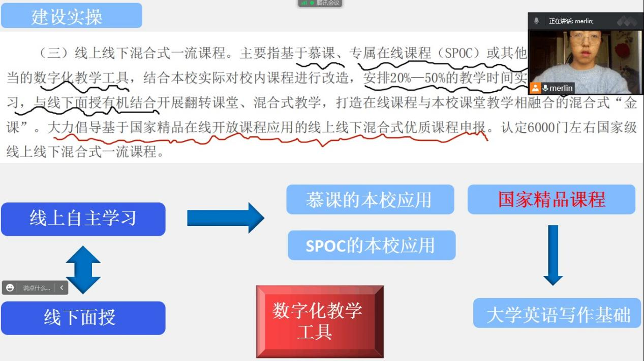 梅琳带领大家学习了新引入国家级一流课程“大学英语写作课程”在雨课堂中的具体使用方法和操作步骤,要求教师在大学英语授课中充分利用现代技术手段,将《习近平谈治国理政》融入大学英语教学与研究。