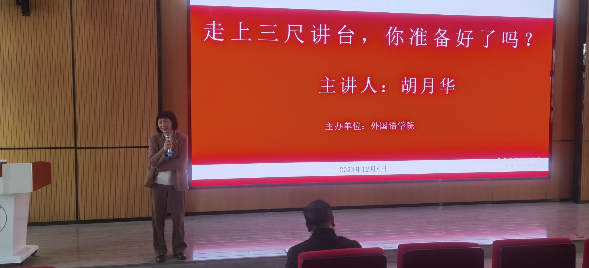 12月8日,池州市教体局中小学英语教研员、正高级教师胡月华应邀为英语师范生作了题为“走上三尺讲台,你准备好了吗?”的专题讲座。英语师范生以及部分英语专业教师聆听讲座。