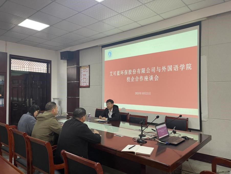10月21日下午,太阳成集团122ccvip与安徽艾可蓝环保股份有限公司举办校企合作座谈会,共同探讨深度合作及创建微专业的可能性,促进商务英语专业和企业的共同发展。
