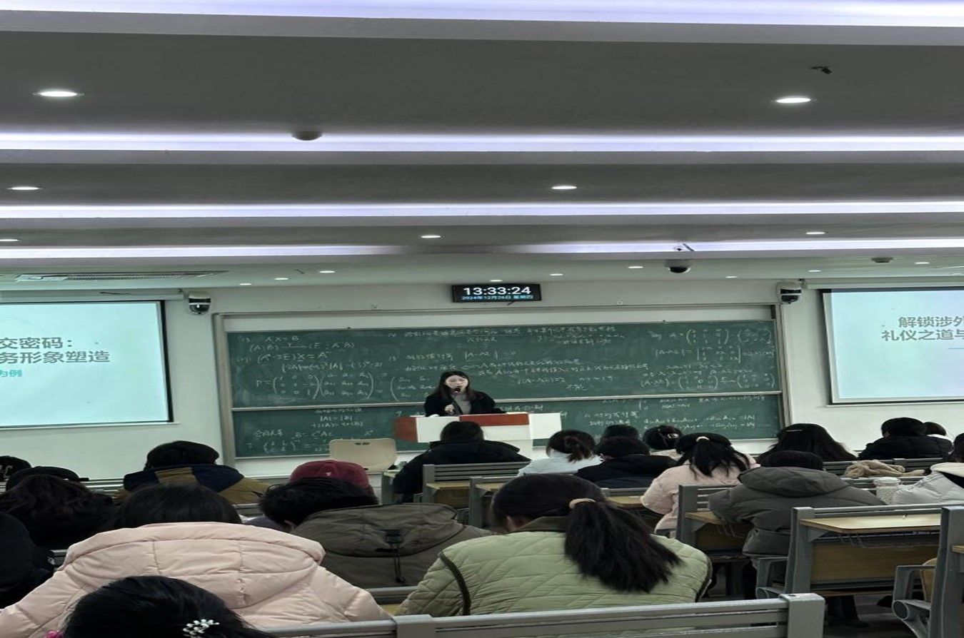 讲座点明涉外商务社交领域中礼仪的重要性。包卿深入探讨跨文化交际中的礼仪差异,从见面礼仪到商务宴请的座次安排,生动阐述不同国家和地区的独特之处。同时,针对国际商务场合下的形象塑造策略,包卿博士也进行了详细解读,大到企业形象的整体呈现,小到个人着装细节,都一一涵盖。