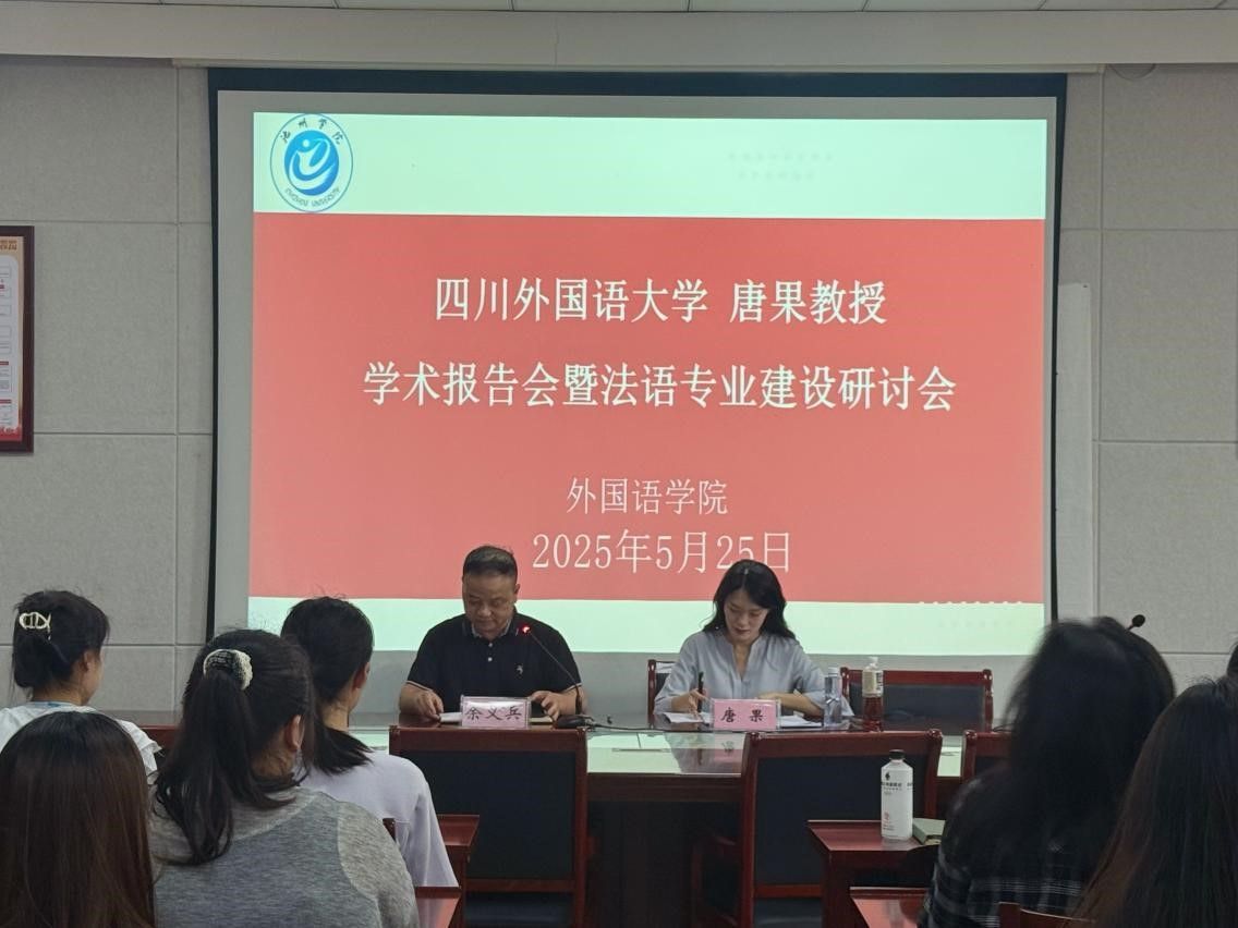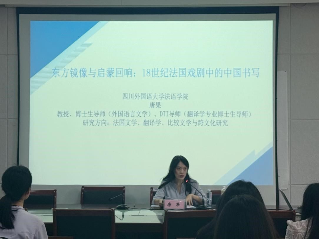 5月25日下午,四川外国语大学唐果教授应邀为太阳成集团122ccvip法语专业师生带来了一场主题为 “东方镜像与启蒙回响:18 世纪法国喜剧中的中国书写” 的学术报告。报告会由公司经理余义兵主持,法语专业全体师生参加。