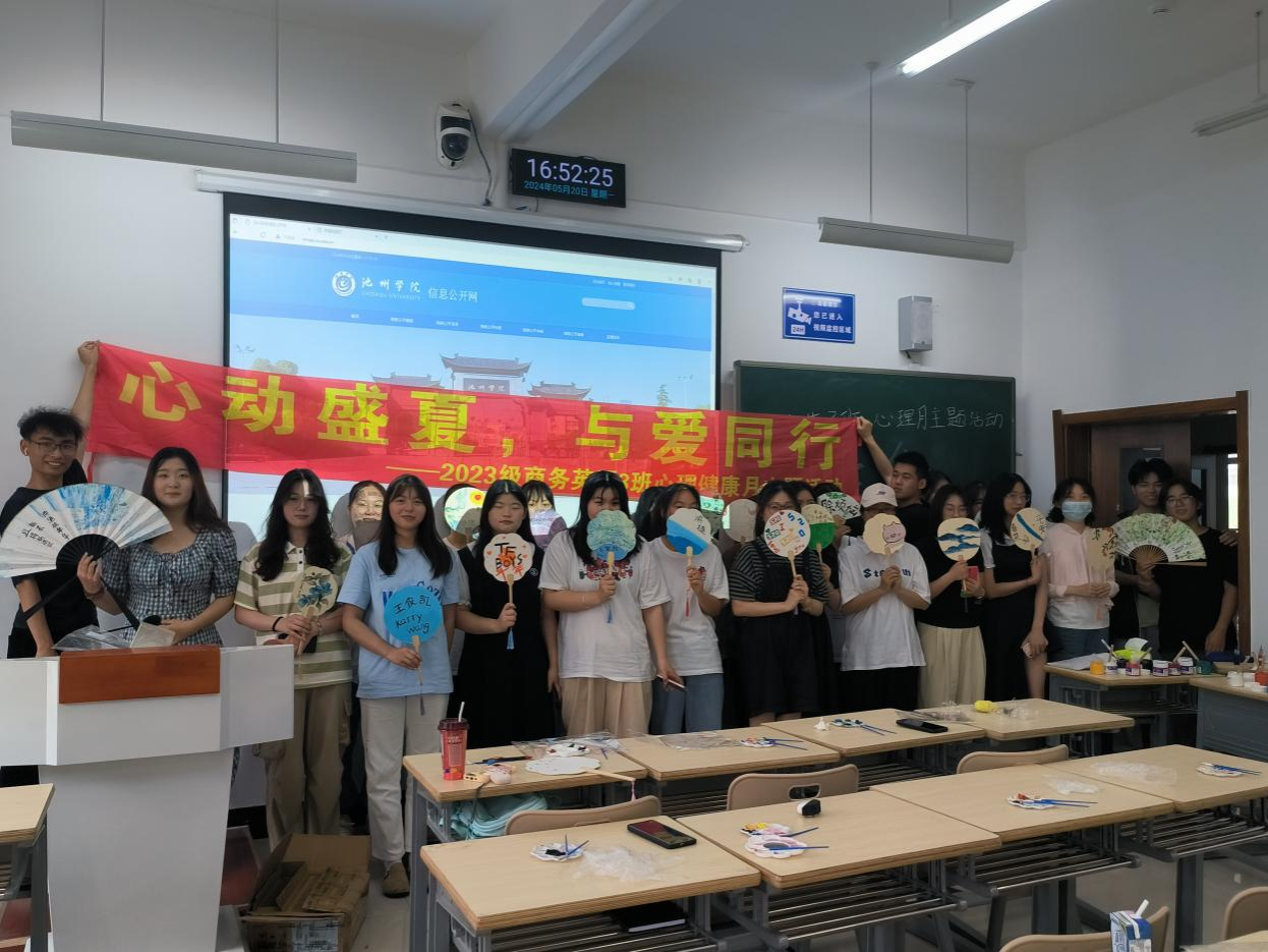 为了促进同学们身心健康,培养大家的动手能力和艺术鉴赏能力,丰富同学们对心理健康知识的了解,5月20日下午,2023级商务英语3班在公教北205开展了以“心动盛夏,与爱同行”为主题的心理健康月活动。辅导员程倩倩和2023级商务英语3班全体同学参加。