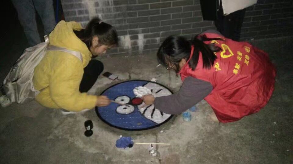 活动前,青协分会负责人向志愿者们详细说明了活动内容和注意事项,并提前准备好活动中要用到的工具、颜料等,以保证此次活动的顺利进行。对志愿者进行分组与分工后,活动正式开始。活动中,青协分会各部门按照前期工作安排密切配合,指导和协助志愿者们的工作。志愿者们充分利用井盖的形状与特点,巧妙地装饰原本“冷冰冰”的井盖。在志愿者们近1个小时的努力下,“灰头土脸”的井盖华丽变身,“逆袭”成为了“萌萌哒”的艺术品:愤怒的小鸟、哆啦A梦、表情包……这些颜色鲜艳、造型各异的图案吸引了不少同学驻足观看,同学们纷纷竖起了大拇指为现场的志愿者们点赞。