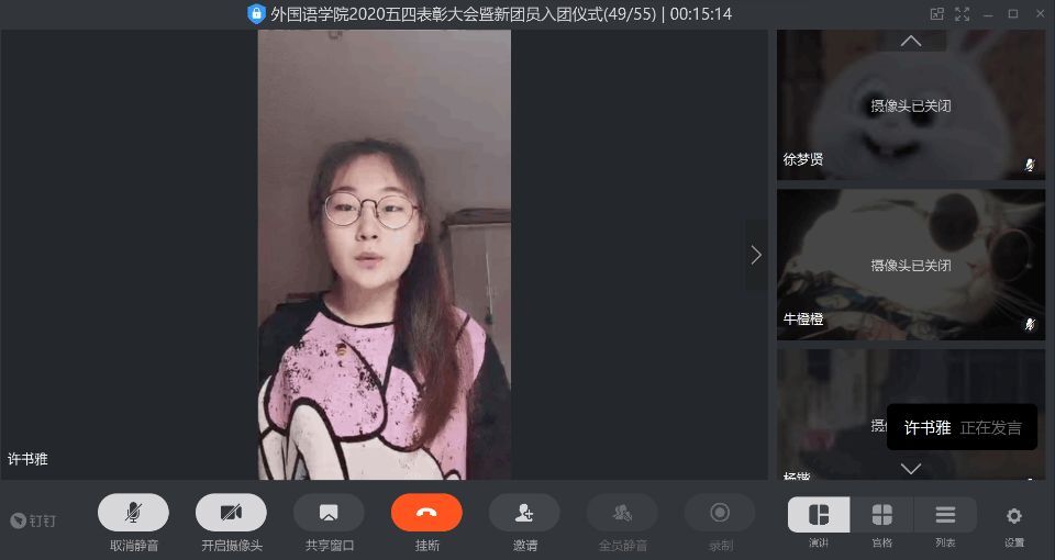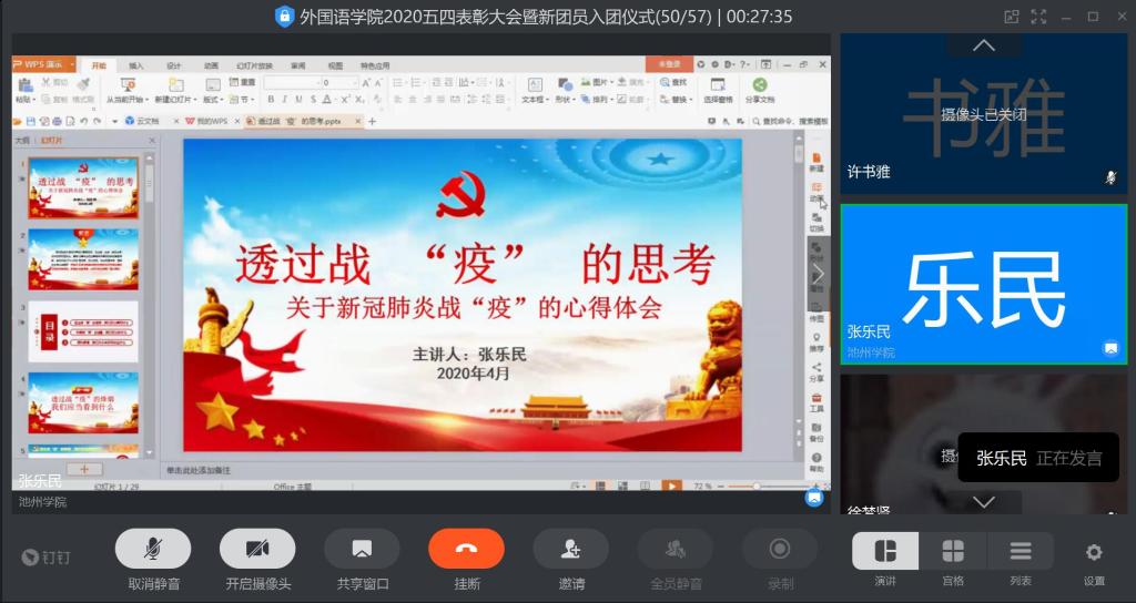 大会在庄严的国歌声中拉开序幕。会上,刘军宣读了“优秀共青团员”、“优秀共青团干部”、“优秀共青团员(防疫专项)”、“优秀团支部”、“人气团支部”和“优秀主题团日活动”表彰决定。19英语1班张梓蒙和19商务英语1班许书雅分别代表优秀团支部和优秀团员获奖代表进行了交流发言。