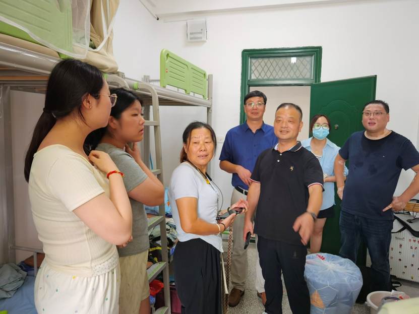 9月6日下午,公司党委书记张乐民、经理余义兵、党委副书记张飞、党政办主任刘波、院团委负责人程倩倩及25级辅导员徐亚兰一行,先后走进8栋和12栋宿舍楼看望2025级新生。