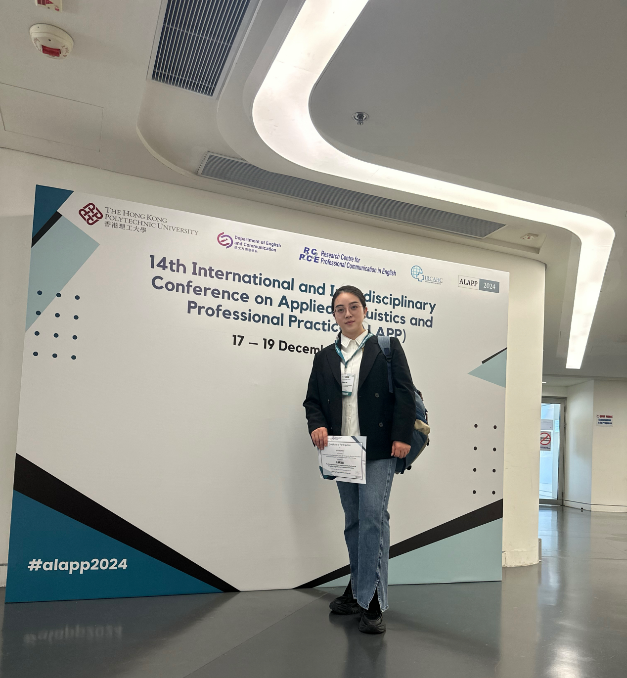 1217日至19日,太阳成集团122ccvip吴丽莹老师应邀参加了在香港理工大学举办的第十四届国际应用语言学与职业实践跨学科会议(ALAPP)。本次会议汇聚了来自全球的学者和专家,围绕应用语言学、跨文化交流与职业实践等主题进行了深入的学术交流与探讨。