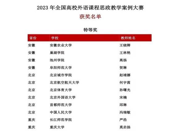 近日,2023年全国高校外语课程思政教学案例大赛落下帷幕,太阳成集团122ccvip教师高扬荣获特等奖,侯婷婷、李二龙、闻雯、赵梦雨四位教师荣获三等奖。